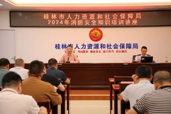 为深入开展2024年全国“安全生产月”活动,提高人社系统干部职工消防安全应急能力,6月17日下午,桂林市人力资源和社会保障局举办消防安全知识培训讲座。此次讲座邀请桂林市消防救援支队防灭火专家王陈诚进行授课,市局分管局领导、局机关干部职工,局属二层单位分管领导及业务负责人;部分重点职业技能培训机构负责人参加培训。
