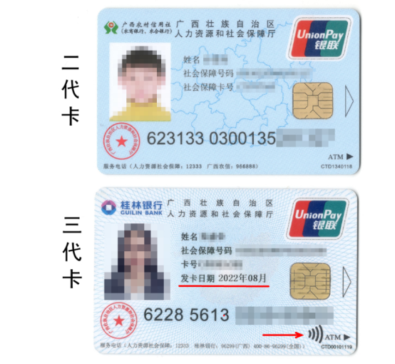 当前全国范围群众手中所持社保卡为第二代社保卡和第三代社保卡,第一代社保卡早期仅在极少数地区发放过,仅限当地使用,后被第二代社保卡迅速替代。第二代社保卡真正实现了全国统一标准,跨省通用。广西壮族自治区只发放过第二代社保卡,从2022年起停止发放第二代社保卡,开始发放第三代社保卡。