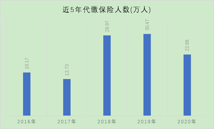 (2)全面落实社会保险扶贫政策,减轻困难群体人员参保缴费负担。“十三五”期间,政府代缴部分或全部代缴保费人数分别为:2016年16.17万人,2017年为13.73万人,2018年为29.97万人,2019年30.47万人,2020年为22.88万人。