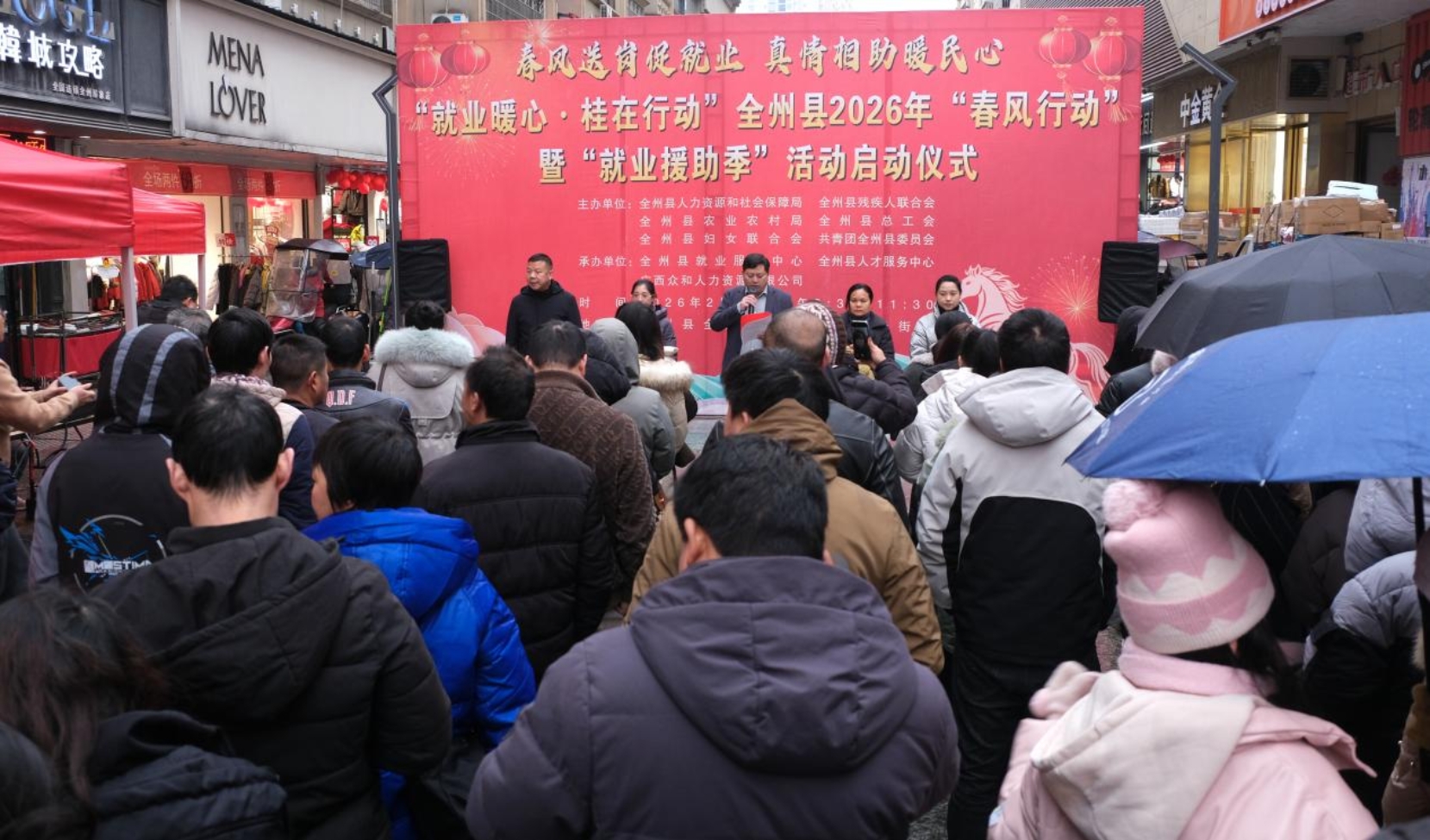 2月10日,“就业暖心·桂在行动”全州县 2026年“春风行动”暨“就业援助季”活动启动仪式在县城民主街举行,20余家企业冒雨前来搜罗人才、入场招聘、提供岗位1600余个。
