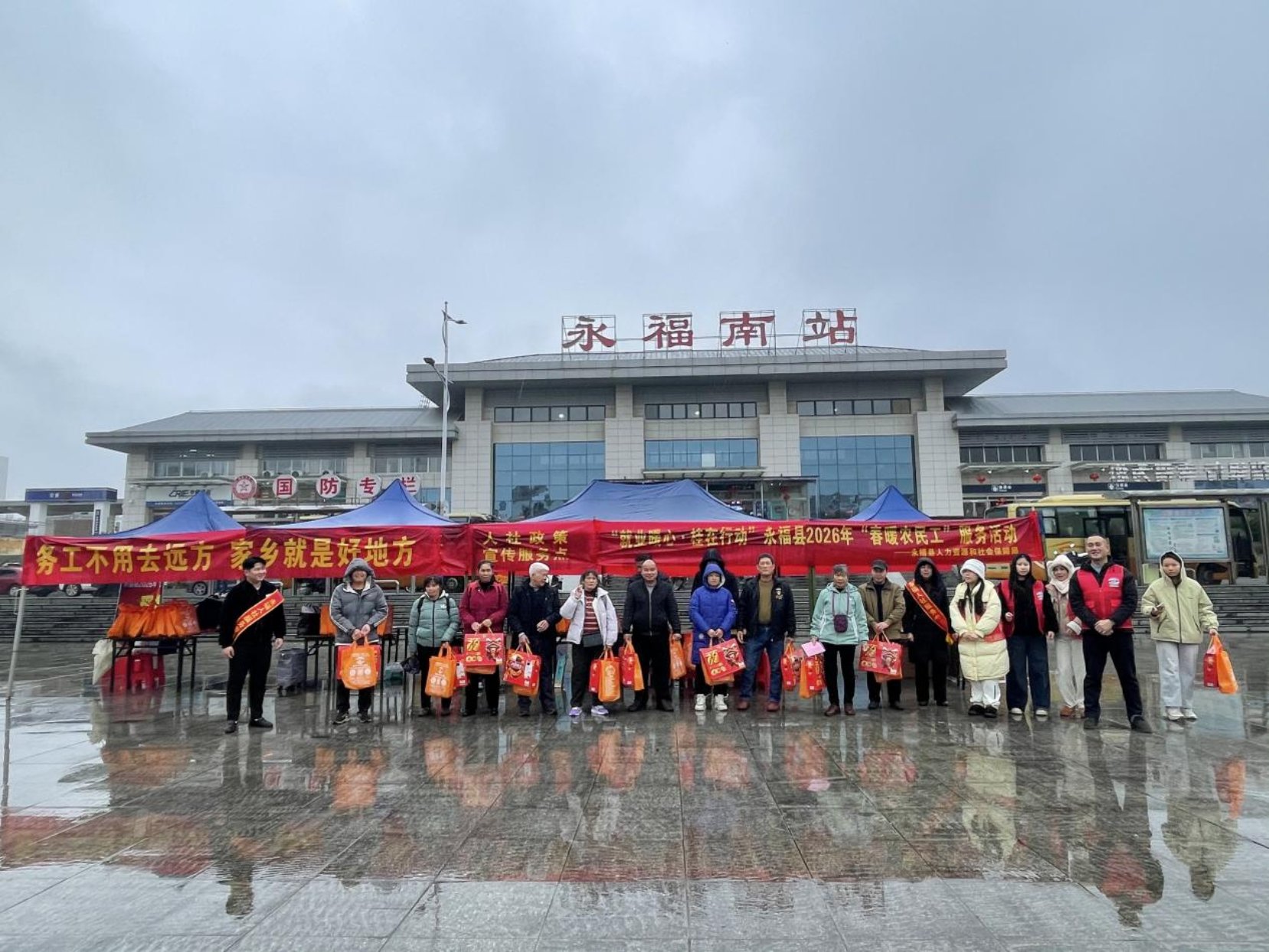 家乡的暖意,从踏上故土的那一刻便萦绕心间。2月10日至11日,永福县人力资源和社会保障局在永福南站广场温情开展“春暖农民工”送温暖活动,为满载乡愁归来的农民工朋友们送上返乡后的“第一份关怀”,这也意味着永福县2026年“春暖农民工”服务行动正式拉开序幕。