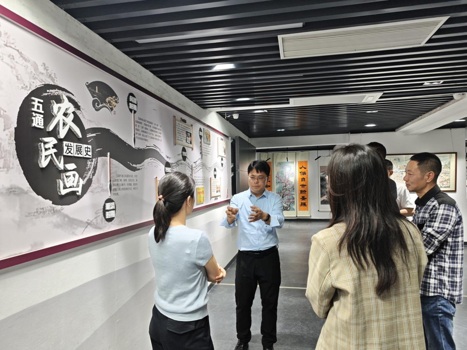 在五通书画艺人同心园,韦普健一行参观了“五通乡村画师”作品展。目前,五通镇规模以上画坊达70余家,从事绘画人员5000多人,书画年产值达到3.2亿元,已形成集原材料经营、艺术创作、装裱、展览展销于一体的全产业链特色书画品牌。参观结束后,韦普健与临桂区人社部门、五通镇相关负责人及乡村画师代表就如何规范化、标准化推进“五通乡村画师”劳务品牌建设进行深入交流。