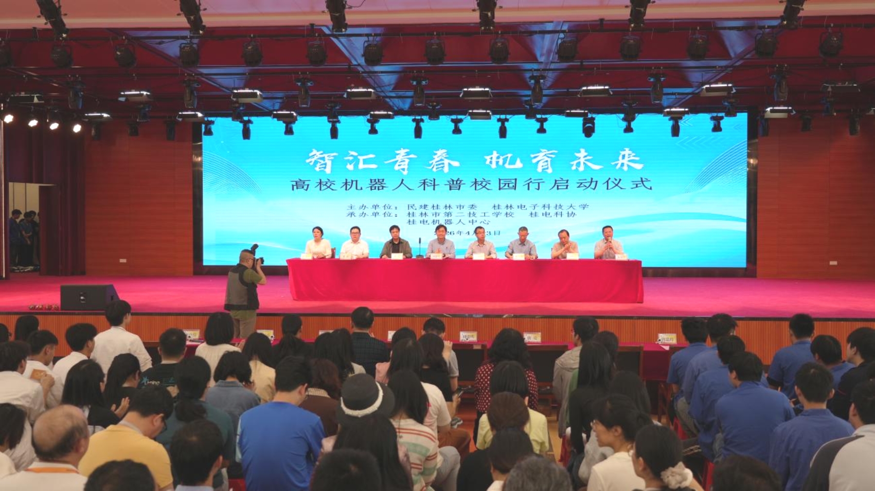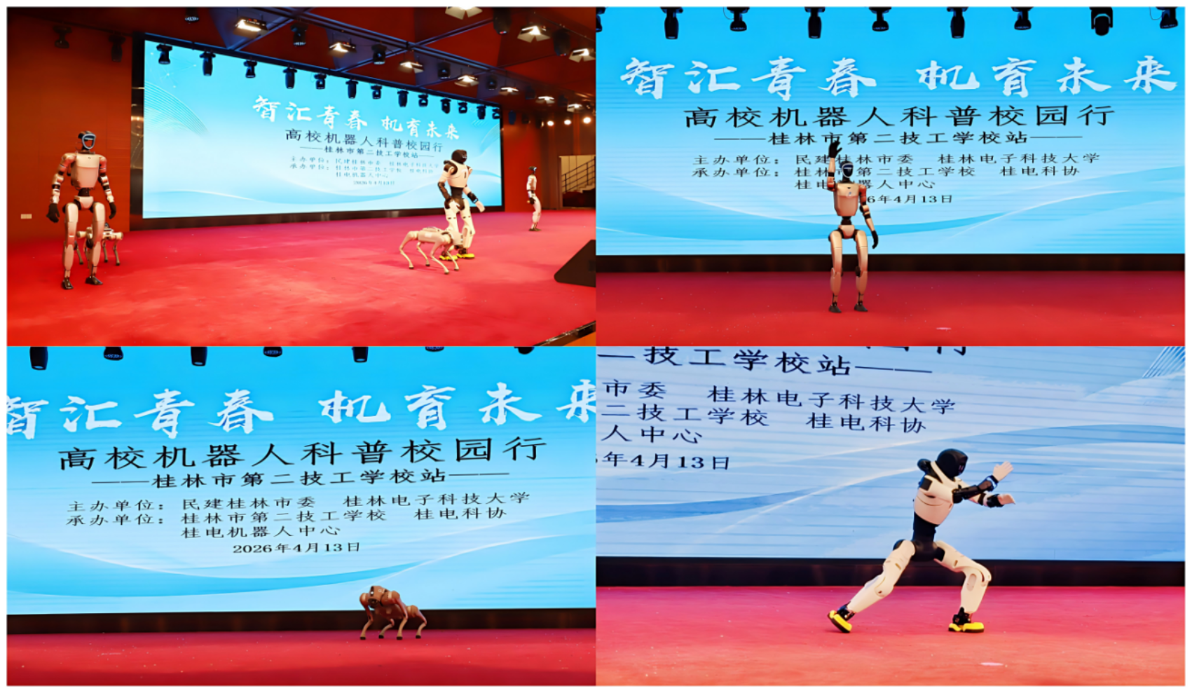 2026年4月13日,由民建桂林市委、桂林电子科技大学主办,桂林市第二技工学校承办的“智慧青春,机育未来”高校机器人科普进校园活动隆重举行。活动以机器人展演、互动体验与科普宣讲为载体,将人工智能与机器人前沿技术带入校园,为师生们献上一场科普盛宴,为校校协同、校企协同、产教融合育人注入强劲动能,为高素质技能人才培育开辟新路径。