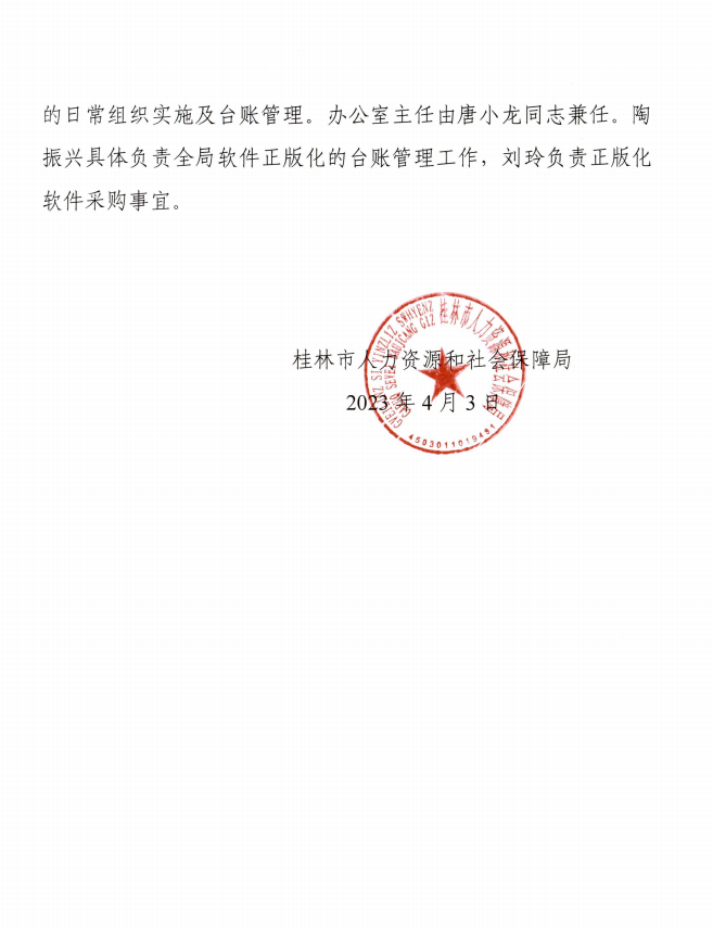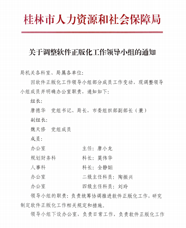 桂林市人力资源和社会保障局关于调整软件正版化工作领导小组的通知
