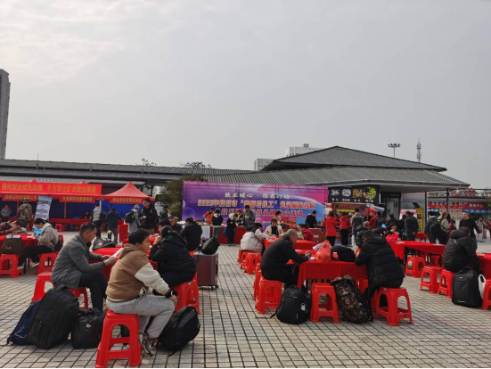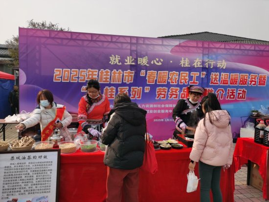 活动期间,在桂林火车北站和桂林汽车北站分别设立服务站,积极为广大返乡归家人员介绍桂林市就业创业、社会保险等便企惠民政策,提供劳动保障维权咨询、法律援助等公共服务;组织比亚迪、深科技、领益制造等用工需求量大的桂林市重点企业进行现场招聘,引导返乡人员就地就近就业;免费提供“八桂系列”劳务品牌桂林米粉、恭城油茶给返乡人员进行品尝;自治区级非遗物质文化传承人还现场展示恭城油茶的制作工艺。一缕浓浓的油茶飘香配上软糯可口的手工糍粑,一勺醇厚浓香的传统卤水配上肥瘦适宜的酥脆锅烧,让务工返乡农民工第一时间品尝到家乡的味道,瞬间感受到家乡的温暖。