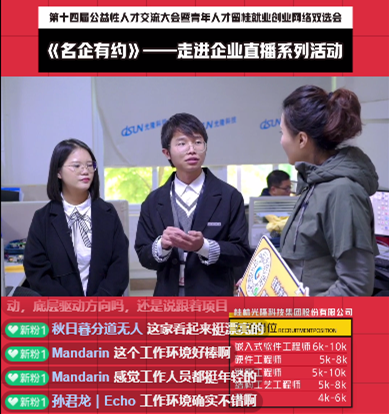 制,更高效便捷,也在线上投递简历的基础上进一步推进求职精细化,提升招聘效果;与此同时,《名企有约》——走进企业系列活动,也打破传统招聘求职信息展示局限,以线上“直播带岗”的形式,为企业的基本情况、文化和福利待遇进行全方位、多角度地展示,为求职者提供求职新体验,有效解决企业引才难、毕业生就业难的问题。“直播结束后的一天内,我们线上发布的五大岗位就累计收到了50余份简历,速度以往常规招聘模式显著提高。”桂林市锐锋医疗器械有限公司蒋经理介绍到。