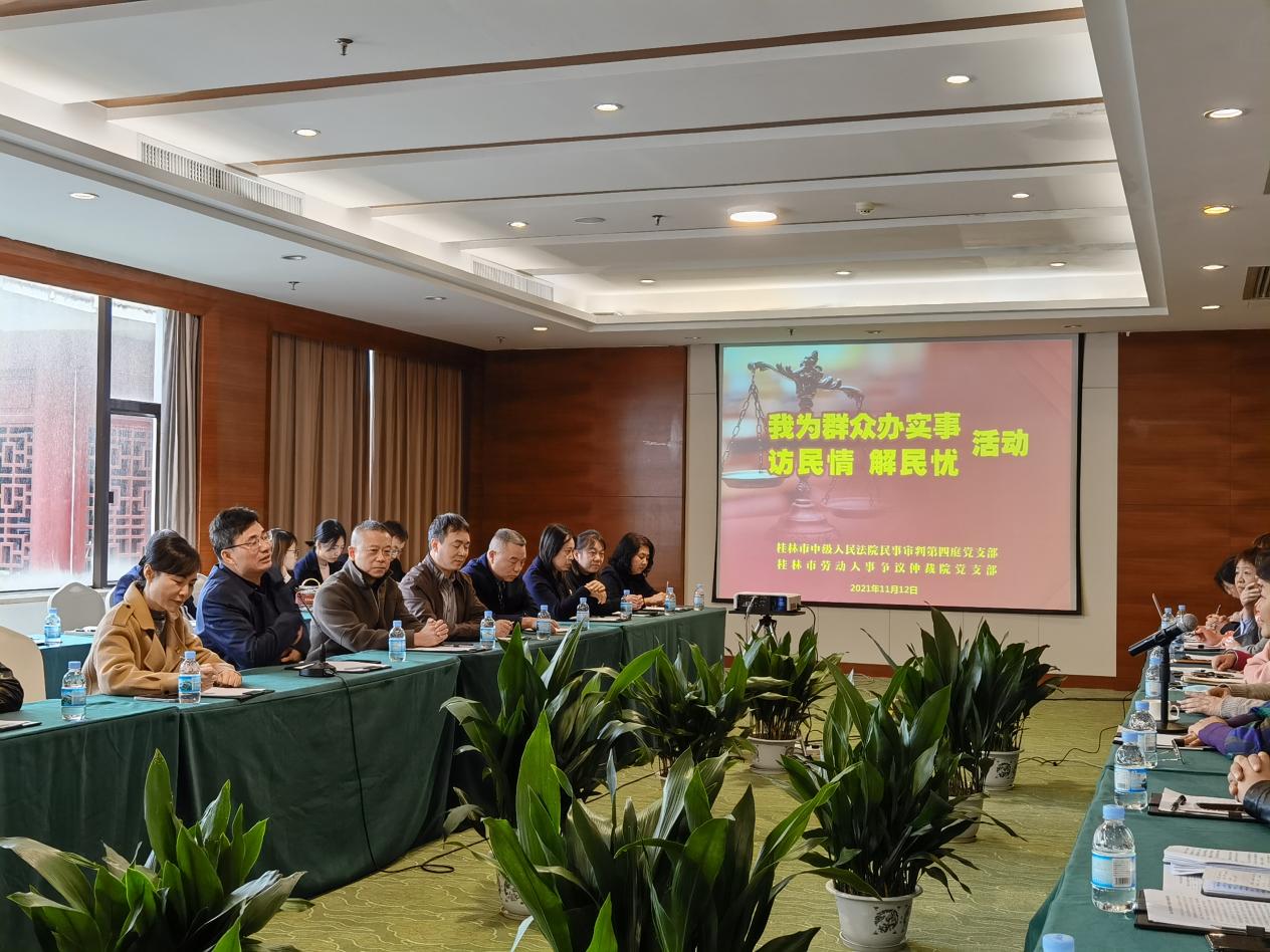 在“为群众办实事”调研座谈会上,两支部为桂林市旅游股份有限公司、冠岩景区、桂山酒店等十余家当地旅游企业,针对试用期规定、规章制度制定程序、开具解除或终止劳动合同证明、医疗期规定等问题上,进行了政策解答及案例分析,为从基层预防、化解劳动人事争议纠纷,企业规范用工管理提供工作建议及政策依据,进一步完善我市劳动人事争议矛盾纠纷多元化解机制,构建和谐劳动关系。