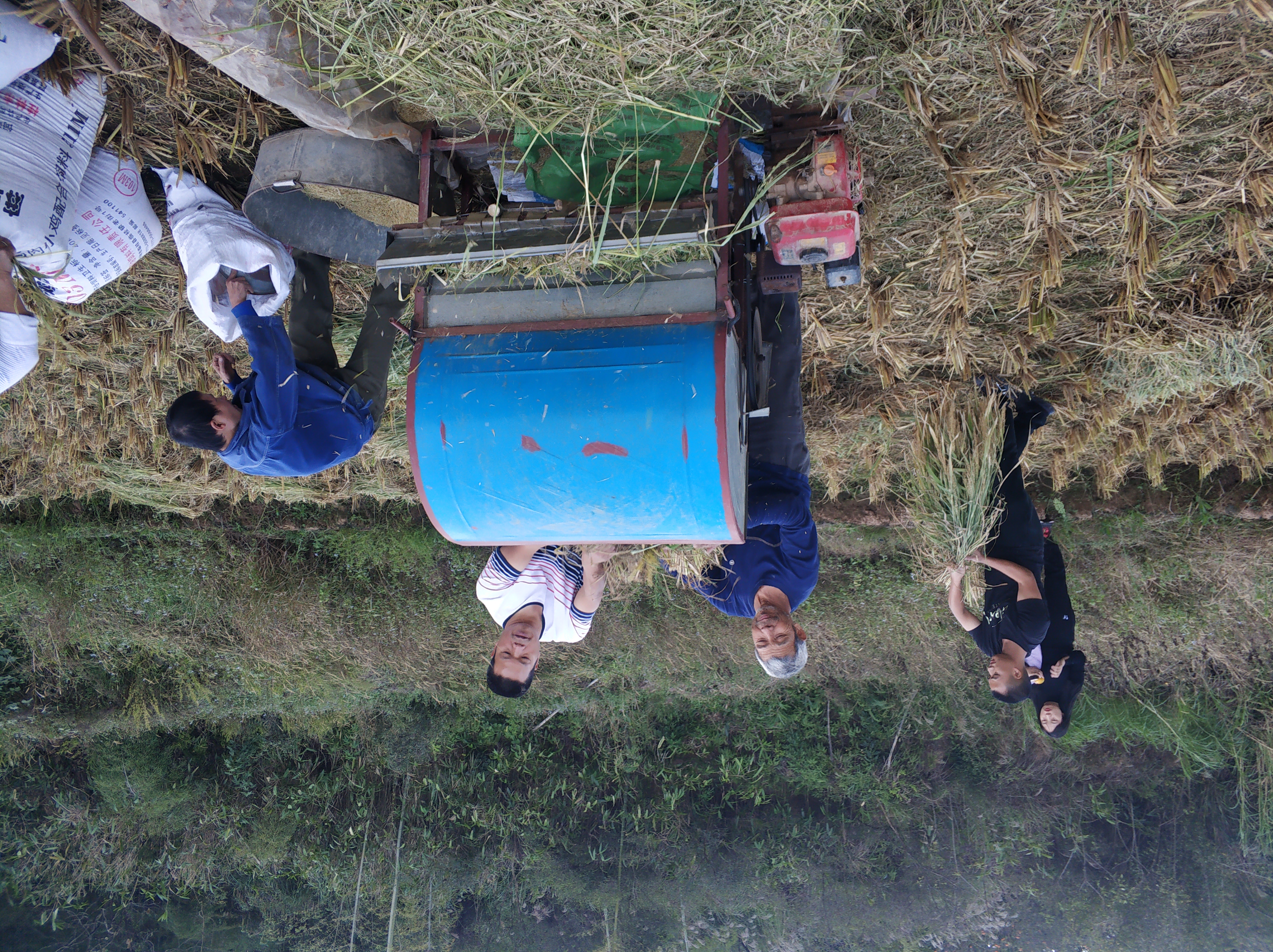 烈日炎炎的下午,第一书记、工作队员和两委如火如荼地展开抢收工作,对稻谷进行了脱粒、装袋,最后将一袋袋丰收的粮食扛上车。他们全力帮助脱贫户救粮,用实际行动为村民排忧解难,确保秋粮颗粒归仓。经过近2个小时的辛劳工作,数块稻田基本抢收完毕。