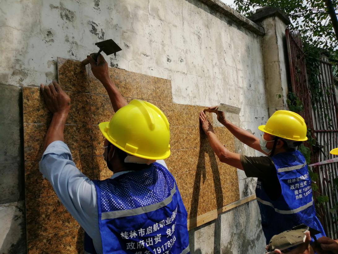 图为:恭城瑶族自治县在栗木镇社会保障服务中心举办室内瓷砖铺贴培训班。