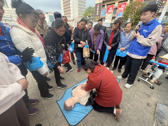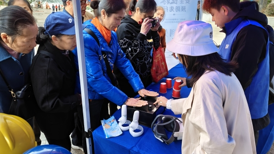 此外,活动还设置了互动体验学习区。工作人员结合社会保险政策和工伤预防知识,巧妙设计触电体验、醉酒体验、消防设备使用和急救知识现场教学等互动体验环节,并设置有奖互动知识问答。在工作人员的指引下,现场人员一一参与体验,在游戏互动中学习社会保险政策、掌握事故预防技能。